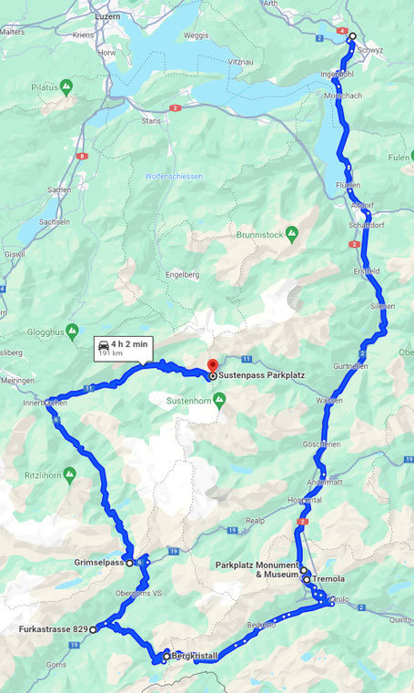 Treffpunkt (Besucher-Parkplätze nutzen, gegenseitiges "Zuparken" ist erlaubt. Gotthardpass (Mikropause, parkieren gemäss Führungsfahrzeug). Nufenenpass (Pause; rückwärts auf der linken Seite des grossen Parkplatzes parkieren bzw. gem. Einweisung). Geschinen (Spezialparkplatz bei Baschi; rechts, ca. 100m vor dem Restaurant bei der Scheune - hier parkieren wir in Reihe rückwärts; will heissen mit Aussicht auf die Strasse. Grimselpass, Sustenpass (Pause, rückwärts parkieren; links vom Tunnel am Hang. Die Verabschiedung findet ebenfalls auf dem Susten statt.